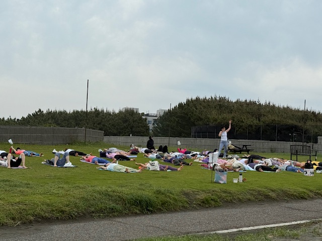 近くの広場ではヨガの教室が開かれ 芝の上にヨガマットを敷き、インストラクターの指導で色々のポーズを取ってヨガを楽しんでいた。