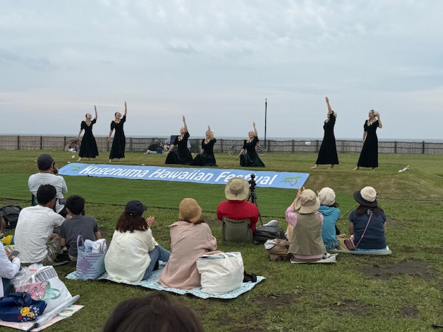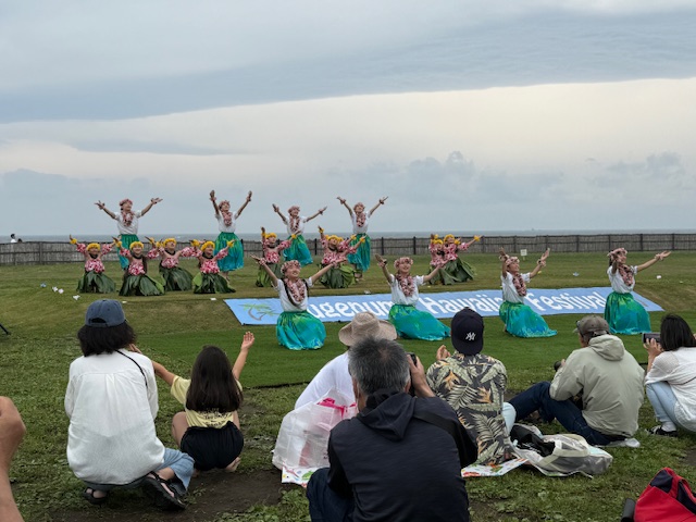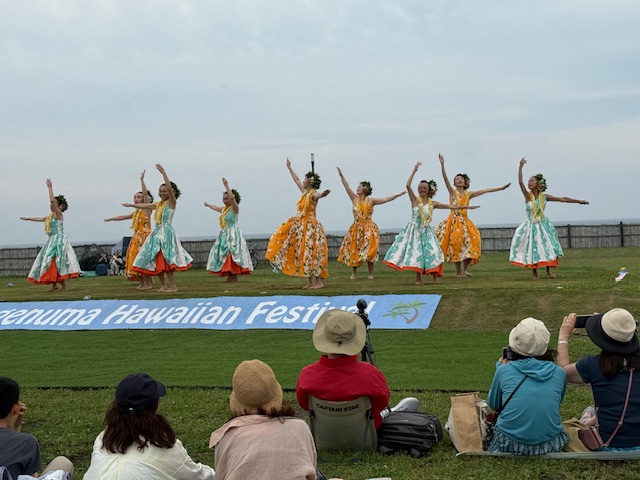 江の島の海を背にした芝の公園のステージでは20を超えるフラダンスサークル、教室メンバーが ゆったりと優雅な踊り、華麗な踊りを披露していた。観客も近くの芝に座りながら ご家族でしょうか友人でしょうかビデオカメラ、スマホでその踊りを撮影する姿が多く見られた。