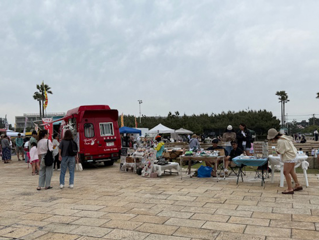 湘南海岸公園の中央、円形のプールサイドにはハワイアンの小物や手芸品を売るお店が並び南国の雰囲気でお買い物を楽しんだり、キッチンカーでハワイの雰囲気でお食事をしたりが見られた。