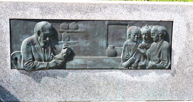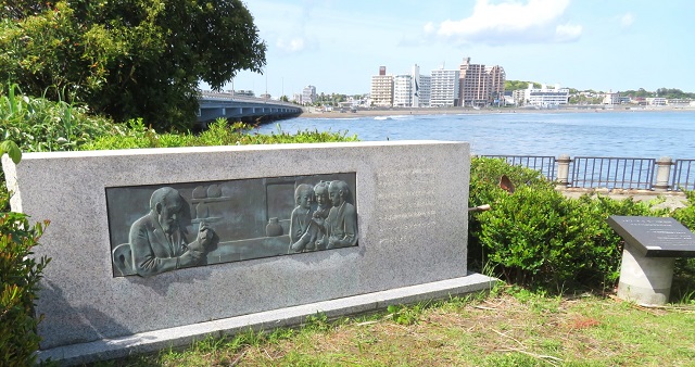 大森貝塚の発掘で知られるアメリカの動物学者、モースは、日本で最初にダーウィンの進化論を伝えたといわれます。貝類の研究を専門としており、日本初の臨海実験所を江の島に設置し腕足類のシャミセン貝を研究しました。日本の動物学や考古学の発展に寄与しました。なお、この記念碑の作者の山本正道は、先に紹介した弁天橋の「雲の形」の作者です。
